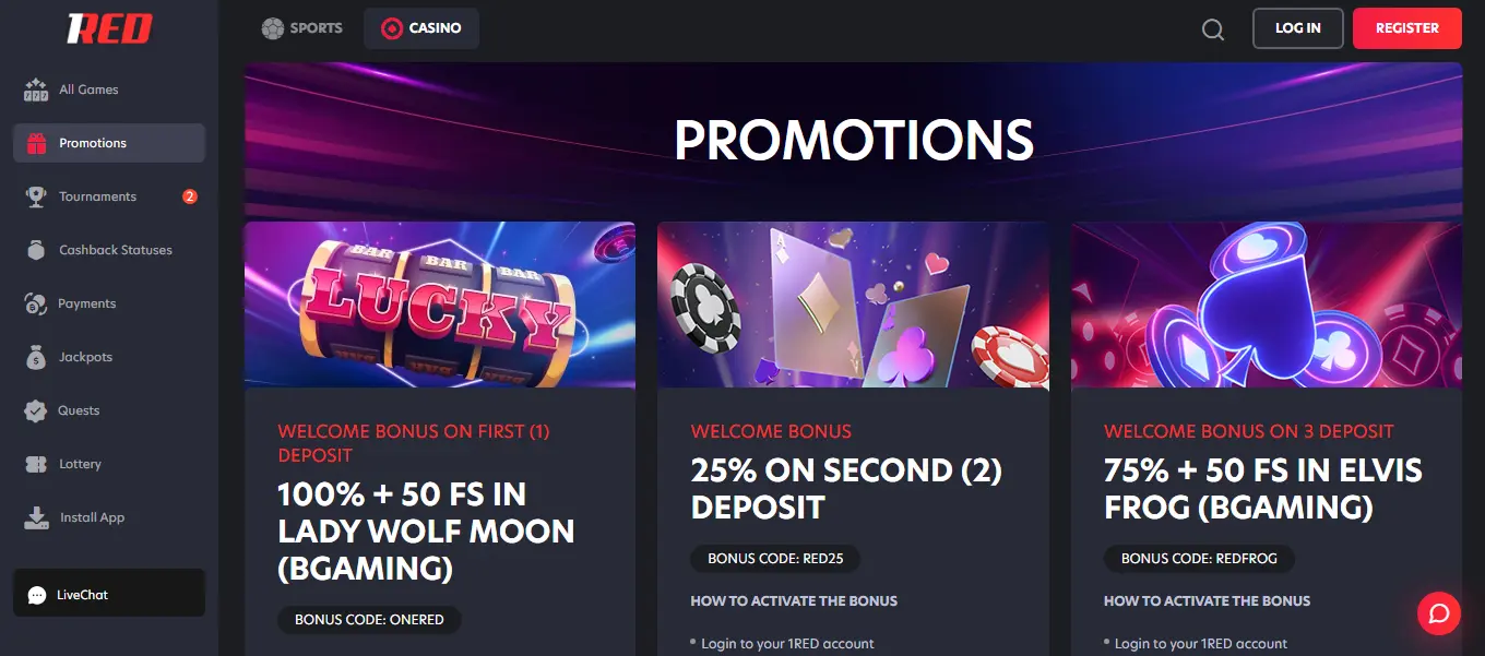 The owners of 1Red want to support registered players and guests with additional bonuses. We are talking about regular online casino promotions for a minimum deposit. Experts conducted a detailed review of promotions and compiled a table of other 1Red bonuses: