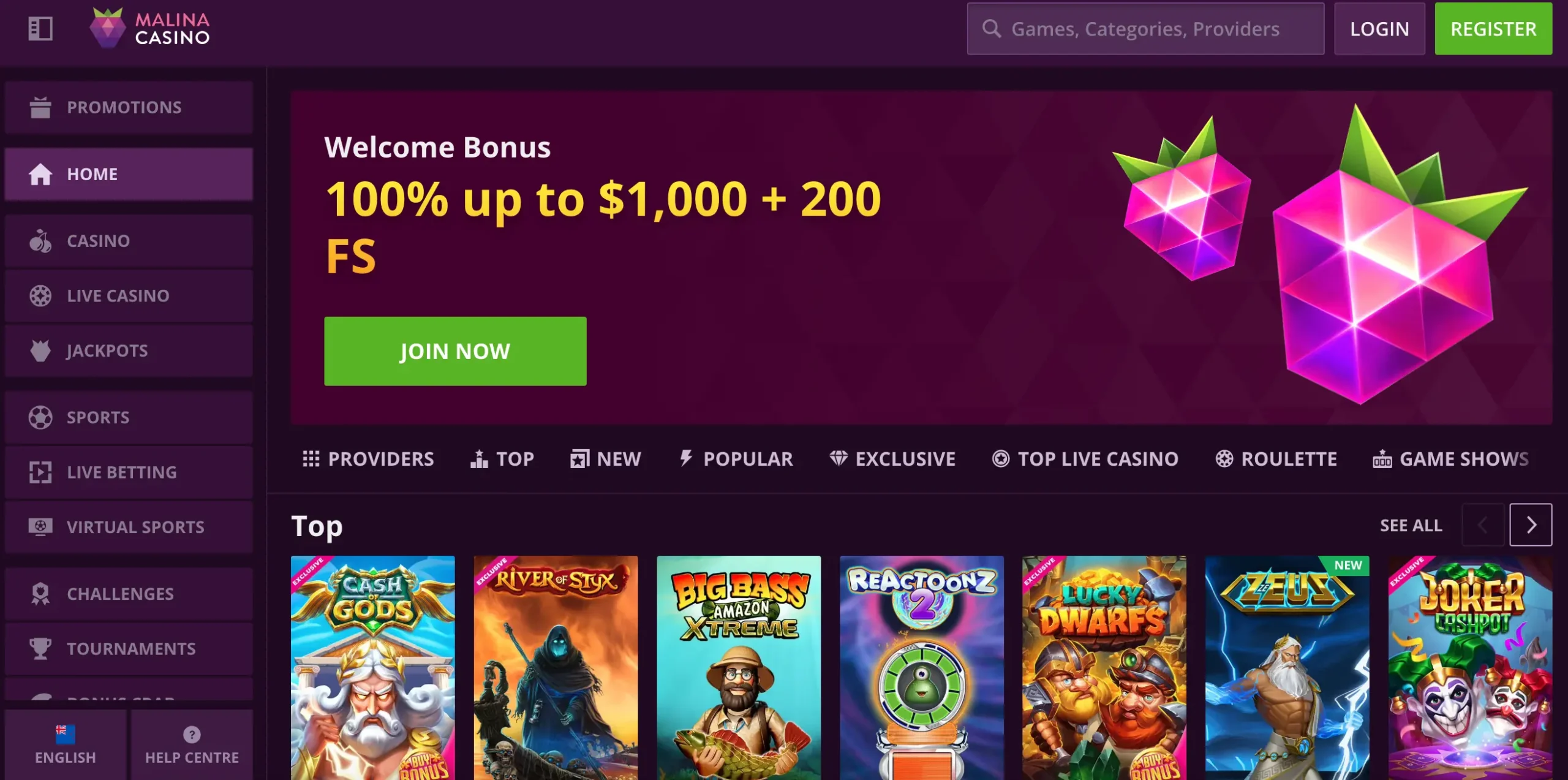 The vast selection of Malina casino games is an excellent reason to become a platform client. In the catalog, you will find over 3,000 entertainment variations; the product of top gambling software providers: Microgaming, Red Tiger, Evolution Gaming, Playson, etc.