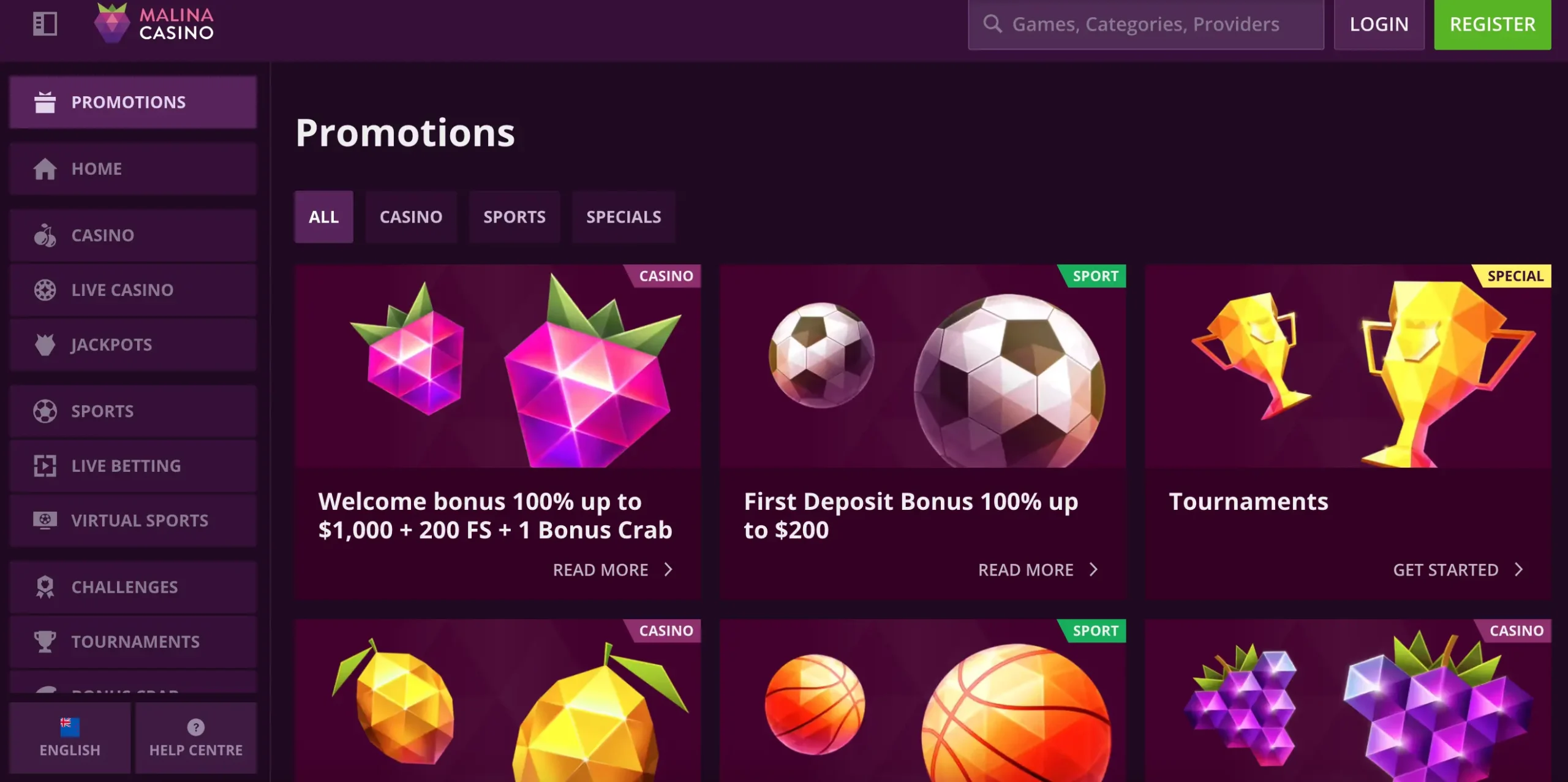 Nearly 8 years have passed since Malina casino was created in 2016, and, naturally, the brand has managed to gain the trust of Australian players, as evidenced by the data from our surveys. Users are offered a welcome bonus of 500 euros and 200 free spins, obtained for just one deposit after registration. But take your time looking for a new platform because regular customers of Malina Casino can also count on bonuses, discussed further in the review.